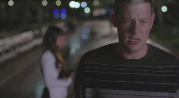 Finn, Rachel, Kurt, and Blaine’s singing is immediate, unrehearsed and the direct expression of their feelings at that moment. The number begins when the first soft guitar chords are heard and Finn turns away from Rachel to sing the first line. Importantly, there is no change in lighting, costuming, or camera movement, as the characters remain in the rather ironically romantic setting of central park at night. The camera does not suddenly become unhinged and break into an MTV aesthetic (such as following the flow of the music or zooming in or zooming out spectacularly), but continues with the midline shots, close-ups, eyeline matches and match-on-action shots between the couples that have been following the dialogue leading up to this point.